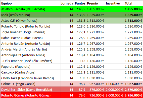 Jornada de muy altas puntuaciones en general, con especial mención a Racosta que lleva 2 jornadas tremendo con sus atléticos. Seguimos el dúo en cabeza y nos alejamos más de los dos siguientes perseguidores. Y no se nos olvide que esta jornada también ha puntuado como la primera de Copa, de la que también hablaré. Así ha ido la cosa.