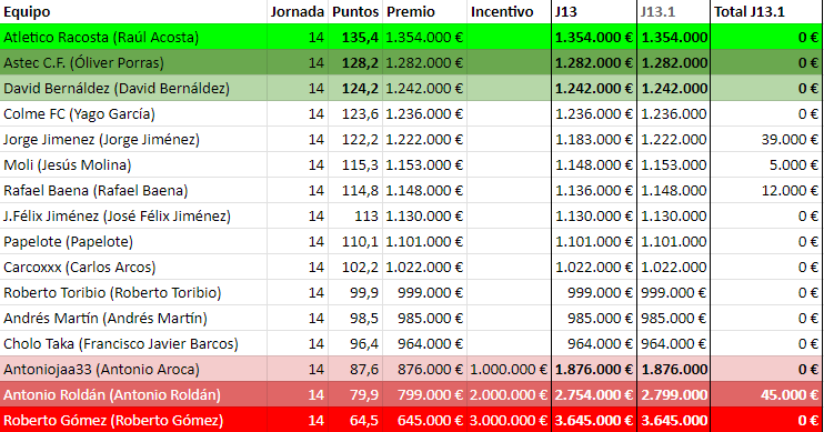 Pocos cambios, nadie llevaba jugadores ni del Mallorca ni del Cádiz, así que las únicas variaciones vienen por el entrenador automático. No ha habido remontadas ni cambios en la clasificación.