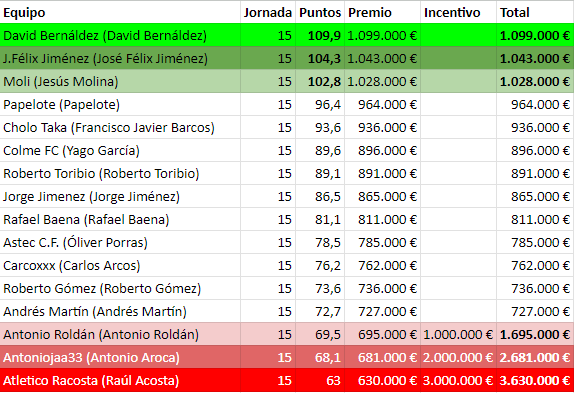 Se quedan con 15 puntos Antoniojaa, Carcoxxx y Antuán a los que se les une Colme FC.