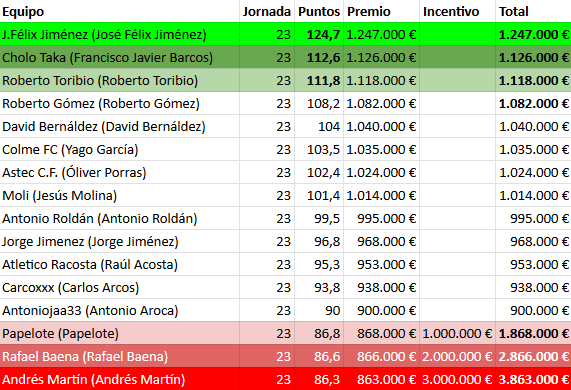 Berni (104 puntos), en un duelo de infarto, al final ganó con el cambio de Vinicius por Isi, que además era del Capitán y puntuaba doble, al Administrador (102,4 puntos) al que no le salvó la actuación de Brahim por Vinicius para sustituir automáticamente a Dovbyk. Por muy poco, pero perdió.