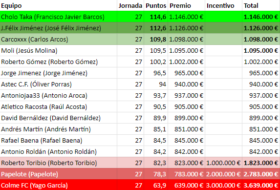 Y por último Colme FC (63,9 puntitos) hace una jornada para olvidar, a pesar de intentarlo con cambios y pierde claramente contra Andrew (85,1 puntos) a pesar de los altibajos en algunas de sus piezas madridistas.