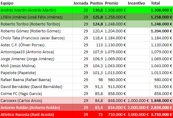 Jorge (106,9 puntazos) con buena puntuación en general de todos sus jugadores y dejándose muchos puntos en el banquillo gana fácil a Antuan (83,4 puntos)que tuvo varias puntuaciones bajas y no eligió al mejor capitán.