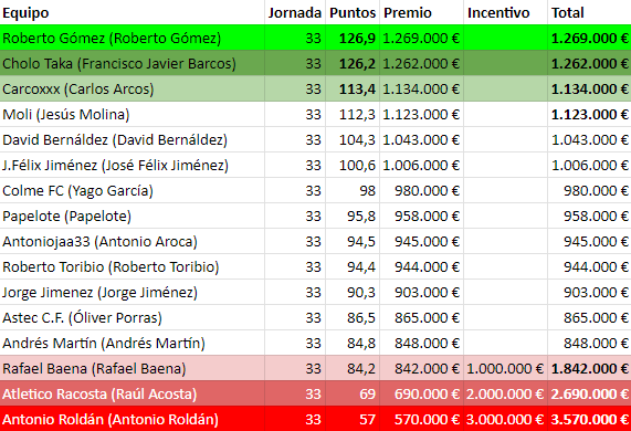 Clarísima victoria de un gran RoGomez (126,9 puntazos) que aupado en su gran capitán esta jornada, hace la puntuación más alta y gana al Administrador (86,5 puntos) al que se le está haciendo muy largo el final de campeonato y lastra sus últimas opciones de optar al mismo.