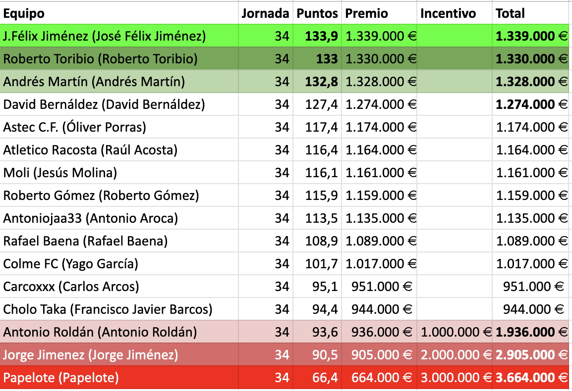 Otro al que le salió muy bien el Capitán fue a Antoniojaa (113,5 puntos) y con ello gana y le para los pies a Cholo Taka (94,4 puntos) que lo intento hasta el final con un buen cambio pero no le dio suficiente.