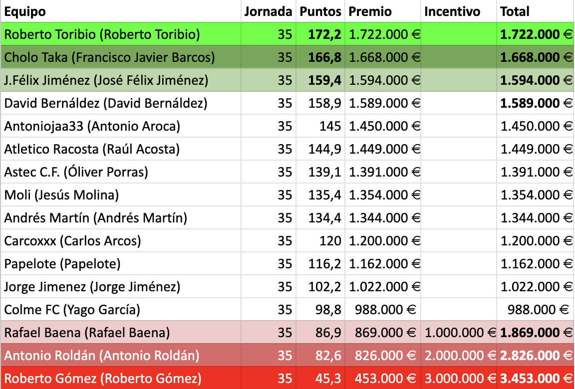 Otro con una buena jornada fue Antoniojaa (145 puntos) que no tuvo piedad con el colista Antuan (82,6 puntos).