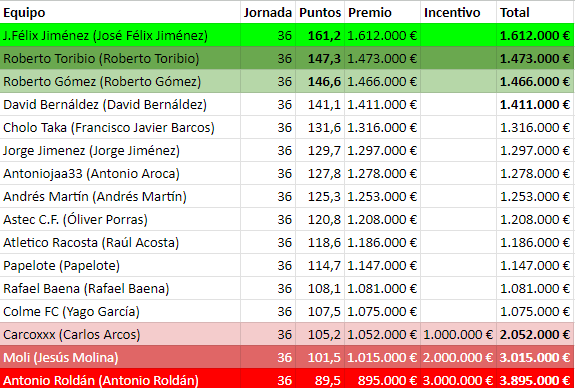 Y por último, Antoniojaa (127,8 puntos) gana gracias a los cambios automáticos a Servidor (101,5 puntos) que no tuve la suerte de mi lado.