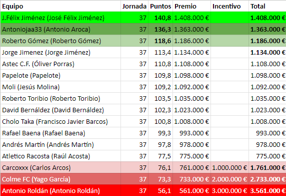 Duelo por la segunda posición entre Administrador (110,8 puntos) que no hizo mala jornada pero se topó contra un irrefrenable Félix (140,8 puntazos) que no baja el pistón y hace la puntuación más alta de la jornada y se asegura el Segundo puesto.