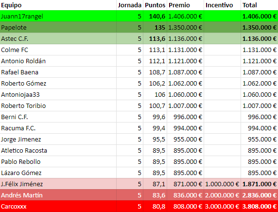 Quinta jornada finalizada! Dos equipos han reventado el marcador, los demás siguen puntuando... y primer empate de la temporada!