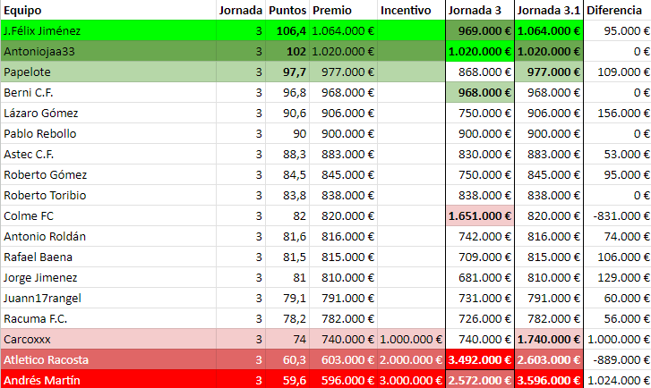 Clasificación en la Jornada 3.1