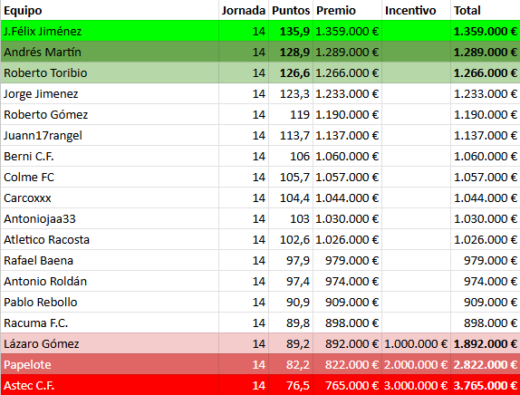Vamos con el resumen de los enfrentamientos de la jornada 14. En esta jornada ya no tenemos partidos aplazados: