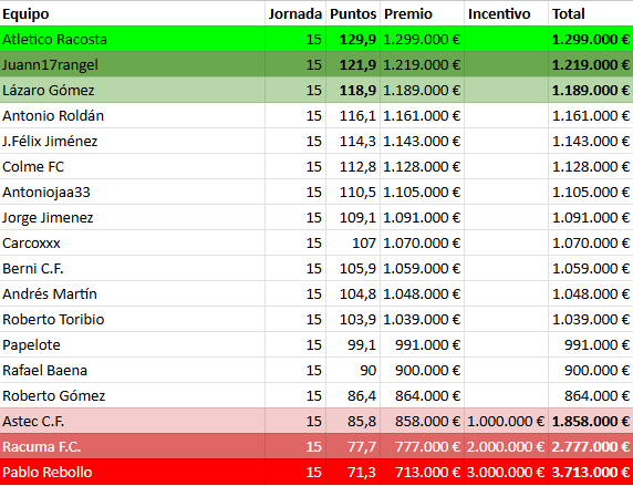 - Astec CF 85.8 puntos VS Berni C.F. 105.9. En el duelo de administradores no hubo tal duelo, Astec sigue con la cabeza en otro sitio y haciendo muy malas elecciones (2 jornadas consecutivas sin capitán). Berni por contra, se mantuvo firme a su estilo y se llevó el descafeinado duelo. Prometo volver pronto, cuando se solucionen algunos temas.