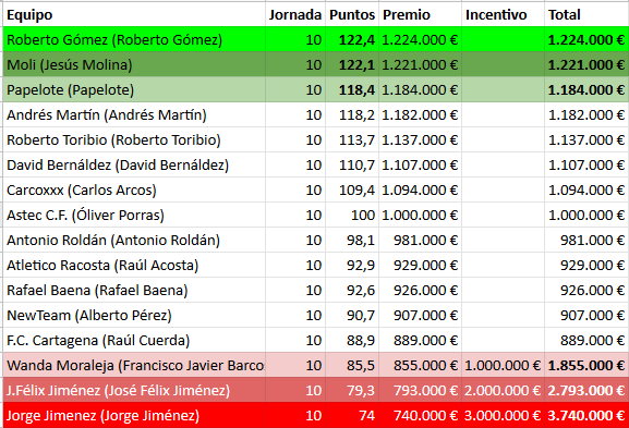 ¡Se le atragantó tanto chuletón, tanta celebración y tanto liderato a Félix, que quedó penúltimo en la jornada 10 y vuelve a compartir el liderato, ahora con RoGomez y Astec. Racosta hizo los deberes y fue a por la victoria con el cuchillo entre los dientes, incluso sacó a Camello, que le había dado 4,4 puntos apostando por un mejor resultado de Jackson, que no llegó.