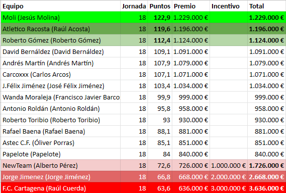 Así queda la clasificación tras la jornada 18 (a falta de los 2 partidos aplazados de la jornada 17):