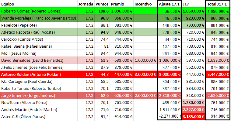 Resumiendo, como dije la vez anterior, los 3 escalones que hay en la general, se agrandan y se empaquetan entre ellos. Quedan muchas jornadas, empezamos la segunda vuelta, así que fichar sorpresas y liarla... :)