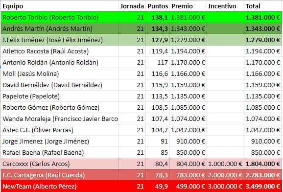 Y por último, Wanda Moraleja (107,4 puntos), se aprovecha de su denostado rival, Newteam, que sigue en sus 13 con Lo Celso lesionado hace meses, con Aitor Ruibal que juega de vez en cuando, con Ainhen que no juega casi nunca y esta semana además mantiene en el 11 a Vinicius de Capitán, cuando estaba sancionado y no jugaba. Y por supuesto no habilita los cambios. Lo dicho antes con Cartagena, así le va... (49,9 puntos)