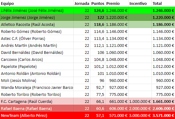Lo de nuestro Administrador es digno de estudio. Siento reiterarme, pero sigue como el Valencia y a pesar de hacer de nuevo una de sus mejores puntuaciones últimamente (113,4 puntazos), perdió el duelo ante un Jorge que, con Vinicius de Capitán y muchos jugadores muy bien puntuados se va a unos 122 inalcanzables puntazos, y eso que en el banquillo tenía 20 puntos más. Astec se la jugó sin suplentes, pero sigue bajando posiciones en la general.