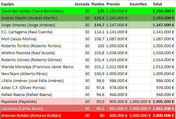 Astec CF, con la jornada perdida a falta del último partido, acabó venciendo a Baena que se derrumbó con el partido del Villarreal y la ausencia del entrenador automático. Al final, victoria para Oliver por 3,2 puntos, que le permite seguir soñando con las grandes gestas.