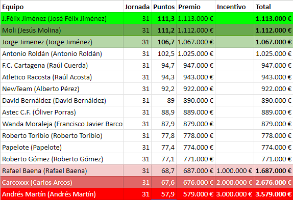 Como ya he comentado antes, esta jornada Andrew se cae junto con "nuestro" Madrid, con la puntuación más baja de la jornada (57,9 puntitos), y le deja la jornada en bandeja a un Cartagena, que lleva ya un tiempo sin tocar el equipo, sin poner entrenador ni cambios, etc... (94,7 Puntos).
