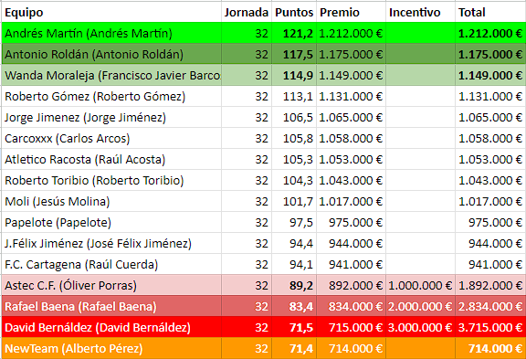 En los otros duelos, Cartagena, sin activar los cambios, perdió (94,1 puntos) contra un Antuán que últimamente le está dando fuerte (117,5 puntazos). Y Carcoxxx, con una buena jornada, que no la necesitaba (105,3 puntos) gana fácil a un Newteam que sigue sin aparecer (71,4 puntitos)