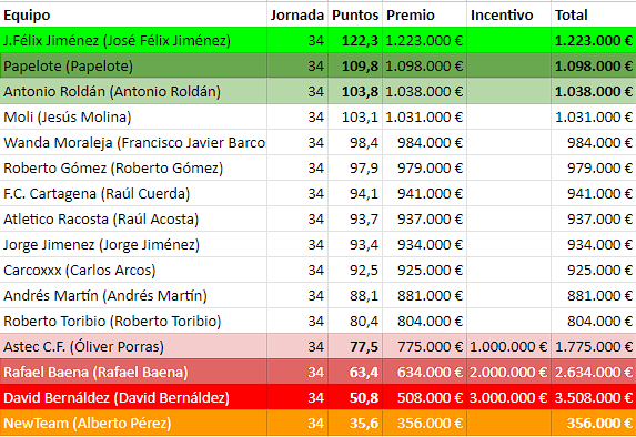 El Líder, Félix, ejerce de tal y con la puntuación más alta de la jornada (122,3 puntazos) gana a Antuán (103,8 puntos), que tuvo posibilidades hasta el último partido, donde necesitaba que Canales le hiciera 20 puntos o más y no se dió. Aun así, Félix, por si acaso, hizo un cambio de última hora de jugador puntuado que le dió rédito, aunque no lo necesitaba...