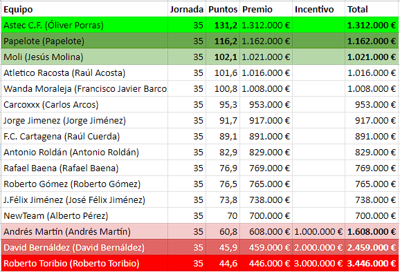 Y el tercero, Don RoGomez (76,56 puntitos), que hizo una de sus puntuaciones más bajas, aun así, gano a un desaparecidísimo Toribio (44,6 puntitos), con la peor puntuación de la jornada y que lleva varias jornadas sin tocar el equipo ni habilitar cambios. En fin...