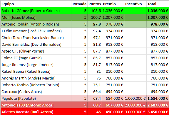En primer lugar, Andrew (76 puntos) sigue 5 de 5 cómo su Madrid y se deshace fácil de un Racosta (45 puntitos) al que le penalizo mucho su Atleti, capitán incluido.