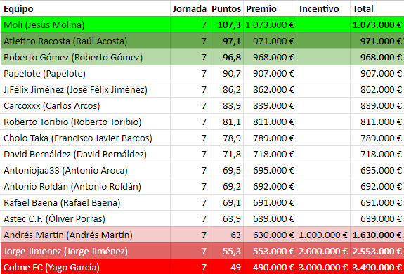 Jorge (55,3 puntitos) sufrió la jornada de las rotaciones, con dos jugadores sin puntuar y sus dos recambios tampoco y pierde ante Papelote (90,7 puntos) al que los cambios automáticos le arreglan la puntuación.