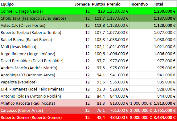 El Administrador hace una buena jornada, con buenos cambios incluidos (112,8 puntos) y gana con relativa facilidad a Carcoxxx (76,1 puntos) al que no le funcionó la delantera, Capitán incluído...