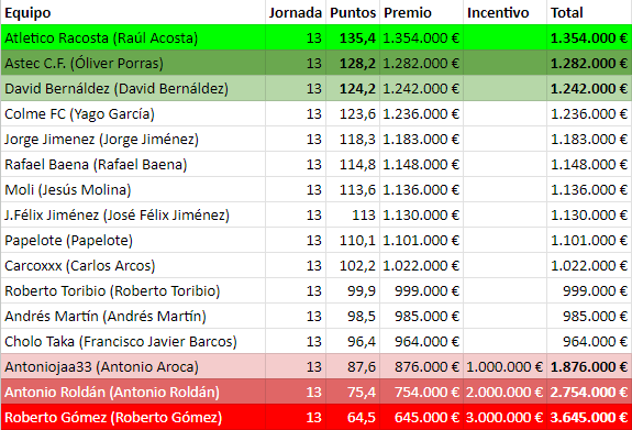 Volvemos a las altas puntuaciones, a pesar de la baja de Bellingham, que está como capitán en muchos equipos. Algunos han salvado la circunstancia mejor, otros peor y a algunos les ha roto la jornada. Y no sé si por ser la Jornada 13, pero el líder ha perdido (a falta del partido aplazado que no parece que vaya a cambiar mucho las cosas). Así ha ido la cosa.